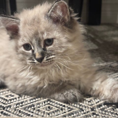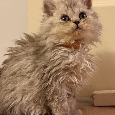 Selkirk Rex har en lockig päls som ras. Kattungen har homozygot vilket betyder att hon har dubbel uppsättning av lockig päls. Du kan läsa mer på Rexringen.se