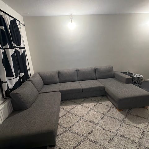 Grå hörnsoffa L-formad i tyg med plats för 7 personer. Soffan har en L-formad design och är klädd i grått tyg. Observera att soffan har synliga fläckar och slitage på tyget. Fläckarna kan rengöras. Tyget är tvättmaskinsrengöringsmedel. Revan kan bytas ut eftersom tyget finns tillgängligt på TradeMax. Soffans storlek är 330 cm x 210 cm. Jag har även en extra sits med en låda som omvandlar denna soffa från L-form till C-form.