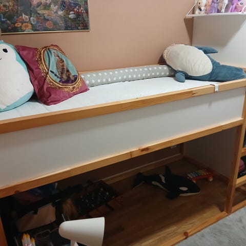 Mio "Nora" Loftsäng 90x200, det är lite ritat på ena kortsidan men går säkert att tvätta bort! Helt okej skick och perfekt för att göra en myshörna under sängen eller lägga dit en madrass för ha plats för 2 sängar.