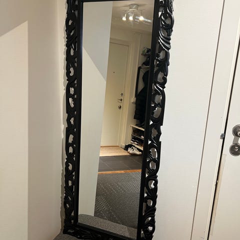 IKEA spegel med ram i trä. Spegeln har en rektangulär form och är utrustad med upphängningsanordningar för väggmontering. Träramen är naturlig i färgen och har en enkel design som passar olika inredningsstilar.