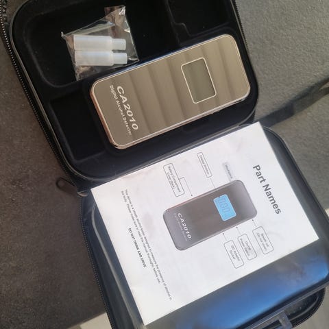 Nogrann mätare som ska kalibreras efter ett år eller 500 blås. Kalibrering sker smidigt med frakt och kuvärt som mottagaren står för. Kalibreringskostnad ca.500kr. Företaget påminner även när det är dax för kalibrering. Fyra blås-munstycken och fodral medföljer. Cirka 250 blås kvar innan kalibrering.