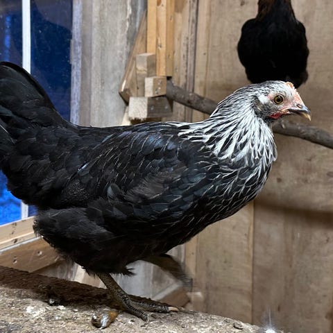En grupp höns med olika fjäderfärger inklusive brun, röd och vit. Används för äggproduktion och som husdjur köpes