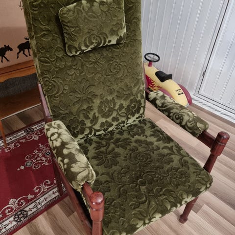 Säljer en äldre retro/folkhemsfåtölj med massiv trästomme och traditionella spiralfjädrar. Fåtöljen är stabil i konstruktionen och har en klassisk skandinavisk form.