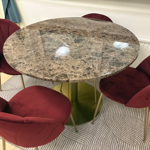 Matgrupp med svart marmorskiva och svarta sammetsstolar