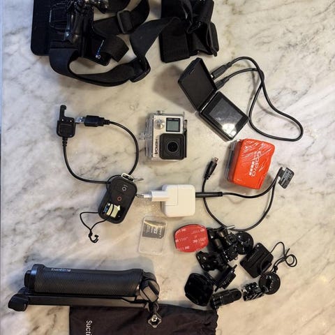 GoPro Hero4 actionkamera med vattentätt hus och monteringsfästen. Kameran är i bra skick utan repor och liknande.