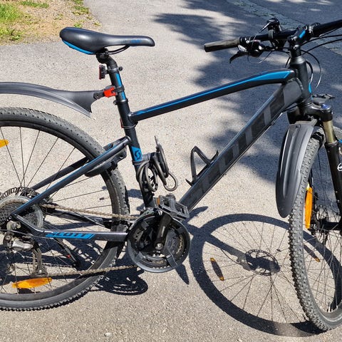 Scott Hybridcykel som är lättcyklad. Cykeln kan användas till vardags eller träning. Färgen är ljusblå och den är utrustad med standardkomponenter för hybridcyklar. Extra lås, lysen, skärmar ingår.