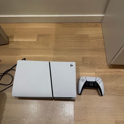 Säljes: Playstation 5 standard disc edition spelkonsol inklusive handkontroll och nödvändiga kablar. Konsolen har en vit design och levereras med laddningsstation för handkontroll. Passar för spel på Playstation 5-plattformen.