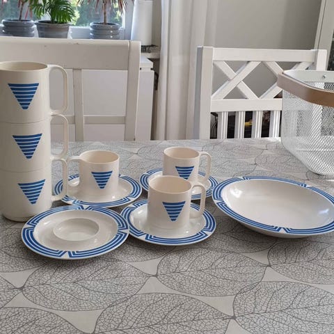 En klassisk picknickkorg i rotting med blå servis, 4 st bestick i plast,4 st tallrikar och 4 st muggar. Perfekt för utflykten!