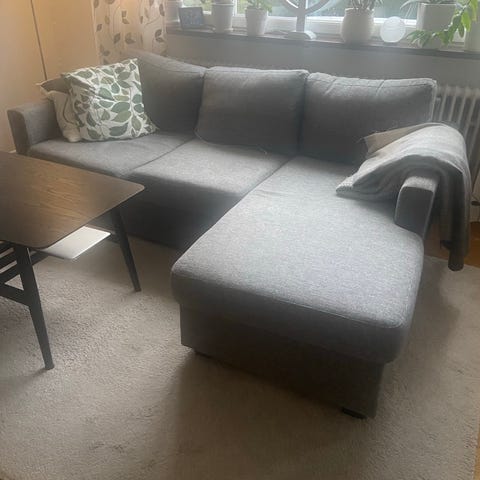 Mycket skön och rejäl soffa. , någon enstaka liten fläck. Vitt soffbord och svart skinnfåtölj