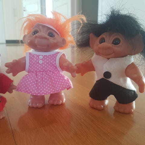 Tre troll från Danmark, i lite lekt skick. Håret lite smutsigt på orange trollet. Resten är blandade troll i olika storlekar. Ett lite större troll, mjuk.