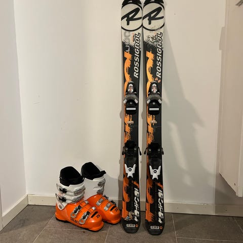 Skidor 110 cm pjäxor + pjäxor stl 33 & 2/3 + ryggplatta