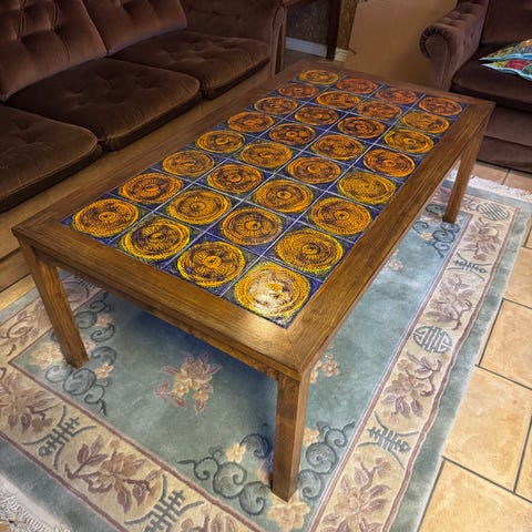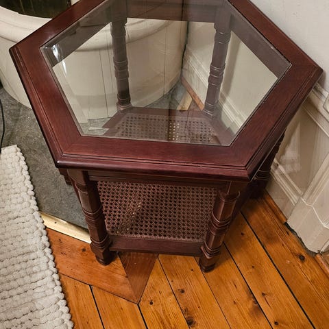 Träet har brukslitage och skavd färg på vissa ställen (se bilder), men annars bra skick. Glasskivan är bruten i ett hörn men limmad och stabil, och har inga synliga repor i övrigt. En ny glasskiva går att beställa från olika företag och kostar ca 2000-3000 kr. Känner ej till designer eller träslag men gissar på ek eller valnöt.