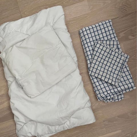 Set bestående av ett täcke och två påslakan med barnmotiv. Täcket är vitt och mäter cirka 100 cm i bredd och 130 cm i längd. Påslakanen har färgglada mönster med djur och naturmotiv. Setet är avsett för barn och är tillverkat av textilmaterial.
