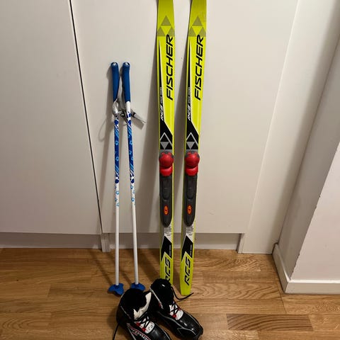 Smidiga skidor som ej kräver pjäxor. Kan användas från ca 24-28 i skostorlek men beror ju även på hur skorna ser ut att spännbanden räcker i omfång. Stavar ca 70 cm.