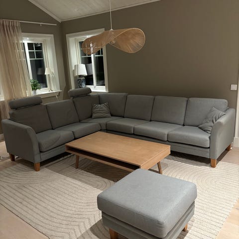 Mio hörnsoffa i mörkblått tyg. Soffan har en rymlig design med generösa sittplatser och lösa ryggkuddar. Passar för vardagsrum och sociala ytor.