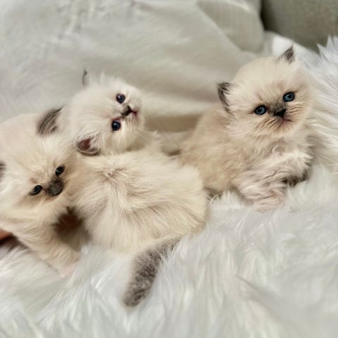 Vi har två stycken Helig birma kattungar, honor, födda 251114 som letar efter nytt hem. Vi tror att dessa är blåmaskade, tabby, eventuellt även sköldpadd. Mamman är brun sköldpaddsmaskad tabby och pappan är blåmaskad. De kan flytta till ett nytt hem vid tidigast 14 veckor.