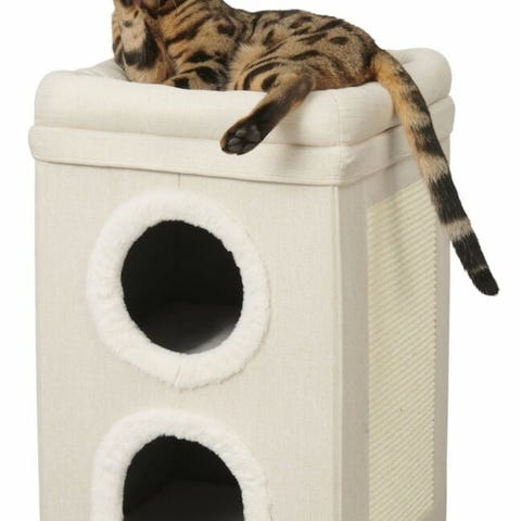 Katthus med tre våningar. Två ingångar och klösbrädor på sidorna. Allt klädd i beige tyg. Möbeln har en mjuk och vadderad insida samt en avtagbar kudde ovantill.