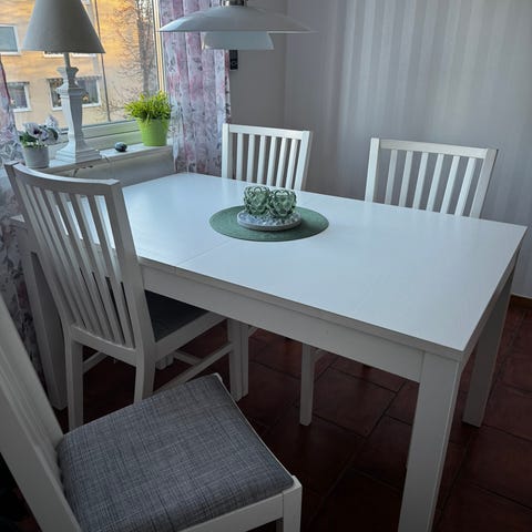 Köksbord 140 cm * 95 cm. Mörkbetsat trä. Inklusive 5st matchande köksstolar. AB Ivar Ericsson.