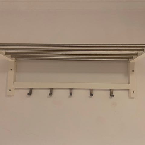 Stilren och praktisk hatthylla med klädstänger, krokar och skohylla. Perfekt för hall eller entré. Gott om plats för jackor, skor och accessoarer.