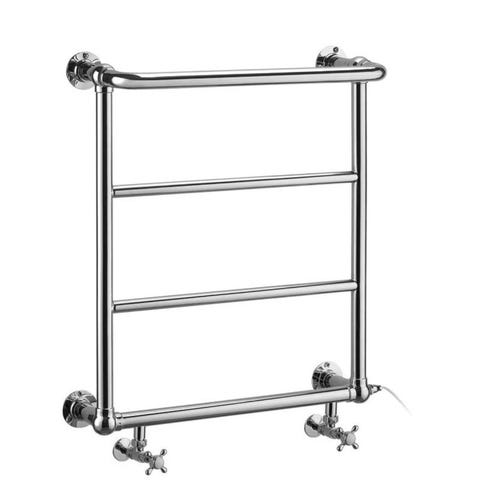 Burlington Cleaver handdukstork i krom. Kan anslutas till vattenburen värme, med elpatron eller båda. Ventiler för vattenburen värme (eller bara prydnad) och elpatron med termostat ingår enligt bilder.