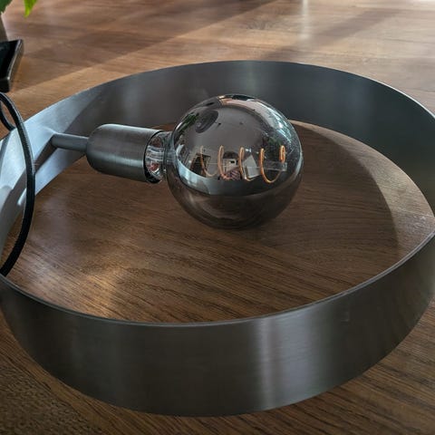 Hängande rund LED lampa grå metall med slank och modern design. Lampan är utrustad med en strömbrytare på sladden och passar för användning i fönstersmyg, över bord eller skrivbord där riktat ljus önskas.