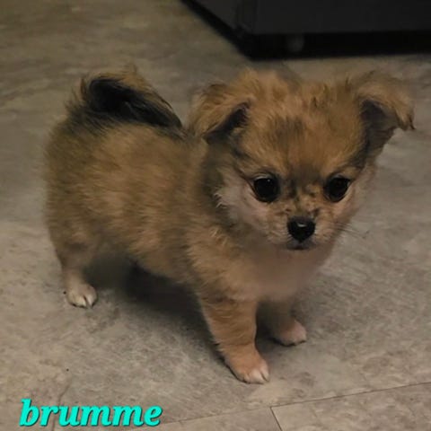 Det här är Hugo han är en blandning mellan chihuahua och pomeranian men misstänker att det finns en släng av papillon i honom också.