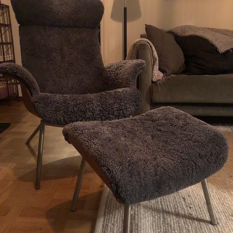 En fin timeout fåtölj från MIO med tillhörande fotpall i vit/grå färg (färgen finns inte längre i sortimentet). Bra skick sparsamt använt .