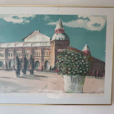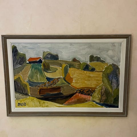 Stor och vacker olja på duk. Målad av Leif Ahnlund, känd för sina målningar av motorfordon i olika miljöer. Motivet föreställer Iain Duffus vid Whitegates på Snaefell Mountain Course, Isle of Man. Mått ca 110x150cm
