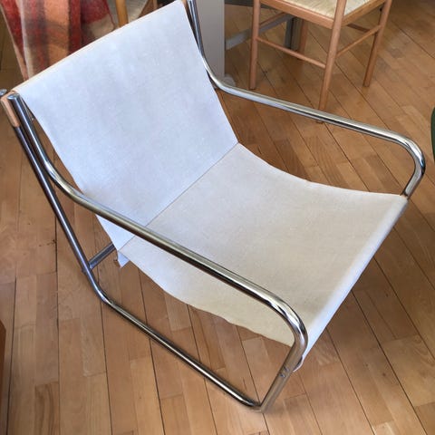 Retro fåtölj, kromad metallstomme. Linne klädsel