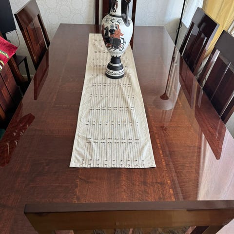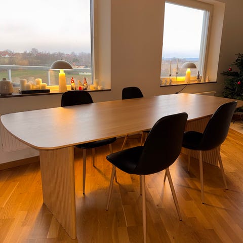 Matbord i massiv ek, rundade kanter. Sextrådsben.