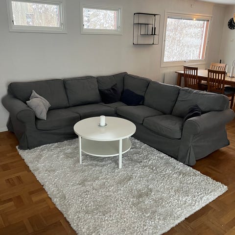 Grått mjukt special tyg, 247cm yttermått. Ikea. Klädsel går att byta till annan färg 5 sittplatser inkl hörnet. 4 år gammal men fräsch.