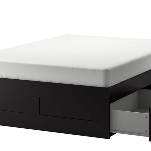 Sängstomme med tillhörande sänggavel från Ikea, modellen heter Brimnes. Sängen har praktisk förvaring i form av lådor under sängen. Sänggaveln har hyllor på sidorna.