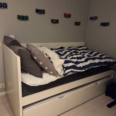 Obetydligt använd ”gäst säng ” 90 x 200 cm från Mio. Väldigt bekväm o i bra skick, även bäddmadrassen! Grått tyg i både ram madrass samt sänggavel. Sängbenen är extra till köpta i silver o champagneformade. Finns på Skurholmen ! Egen bärhjälp vid köp. (Liten trappa i källarförråd )