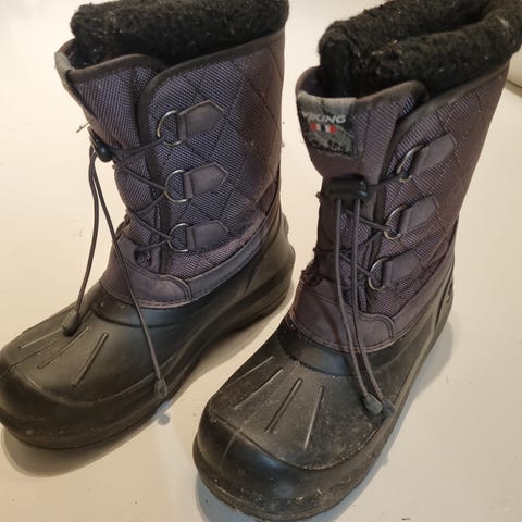 Viking barnstövlar i storlek 37, lila färg, designade för flickor. Stövlarna är tillverkade av slitstarkt material och har en varm, fodrad insida för komfort och skydd mot kyla.