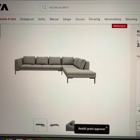 Fin soffa i grått tyg. Finns några smuts fläckar går att tvätta bort.
