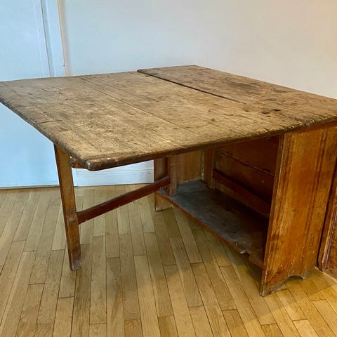 Träbord med utdragbar skiva och förvaringslåda. Bordet har snidade ben och en yta med naturlig träfinish. Passar för användning som matbord eller arbetsbord i hemmet. Utfällt 102 X 96 / Ihopfällt 51,5 X 96 / Höjd 78