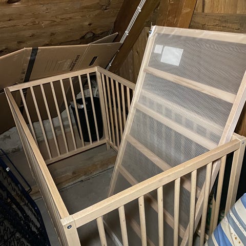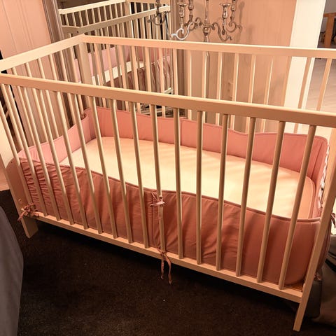 IKEA Spjälsäng barnmöbel i trä. Designad för små barn med spjälor runt om för säkerhet. Passar som barnets första säng och kan användas med tillbehör som madrass och sängkläder.