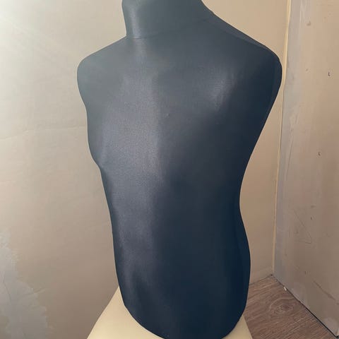 Vit kvinnlig skyltdocka i plastmaterial med avtagbara armar och ben. Dockan står på en rund metallbas för stabilitet. Används för visning av kläder och accessoarer i butiker.