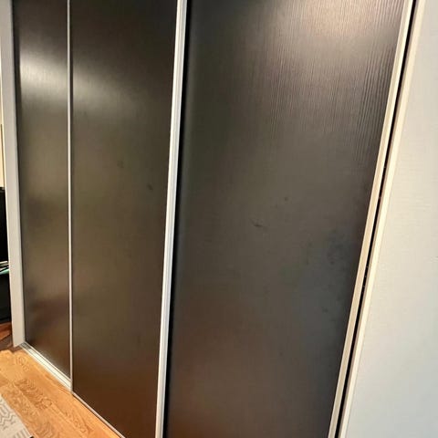 Skjutdörrar från ELFA, 3 st med trälaminat dörrar och en spegeldörr.