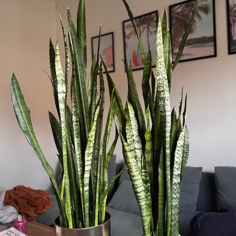 En stor svärmorstunga planterad i en 24 cm kruka. Högsta bladet är cirka 88 cm. Säljes för 500 kronor.