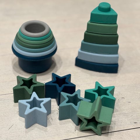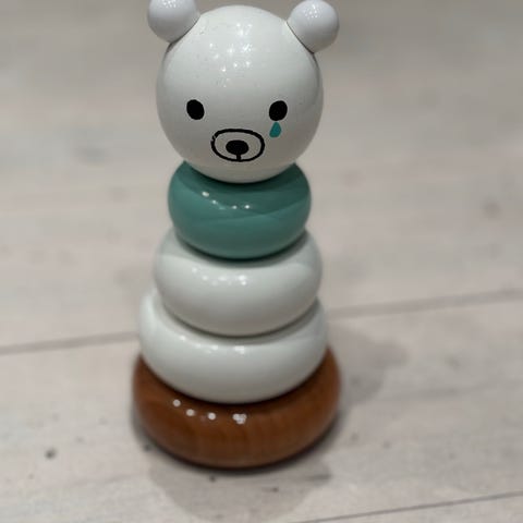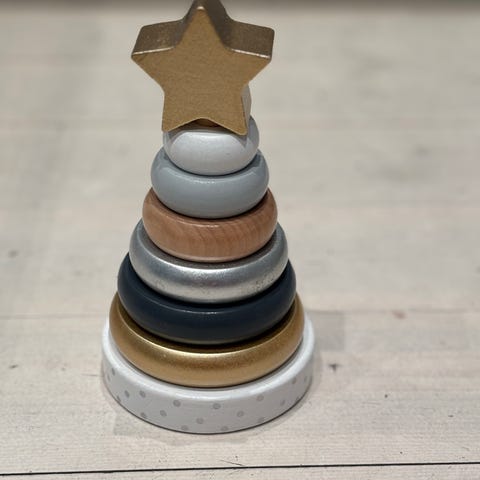 Little Dutch Stapelleksak Rakett i trä med pastellfärger och stjärnmönster. Består av flera stapelbara delar inklusive en rakettbas och en figur med nallehuvud. Leksaken är avsedd för barn och är tillverkad av trä.