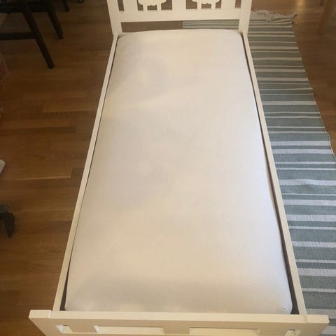 IKEA Juniorsäng i vit färg, utformad för barn. Sängen är tillverkad av trä och har en stabil konstruktion med ribbotten. Passar som juniorsäng för barn och ger en säker och bekväm sovplats.