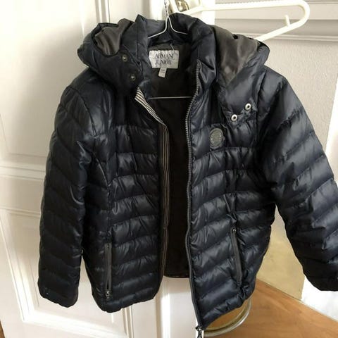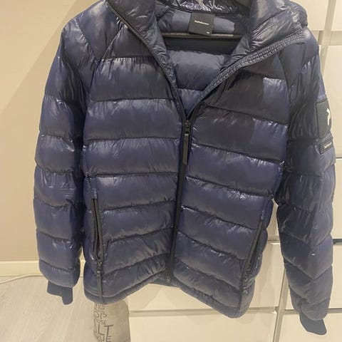 Svart Peak Performance dunjacka med huva. Strl 160. Jackan har dragkedja fram och muddar vid ärmslut. Två mindre revor och en lagning, se bilder, i övrigt supeefint skick.