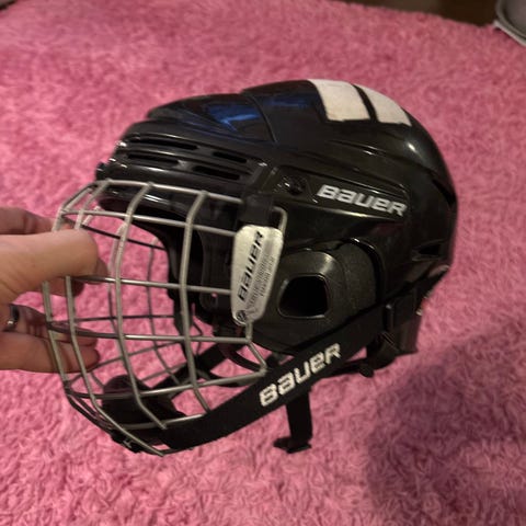 Bauer hockeyhjälm med galler i röd färg. Hjälmen är utrustad med skyddande metallgaller och är avsedd för ishockeyspel.