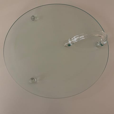 Vacker rund glasplatta med kantmönster.
