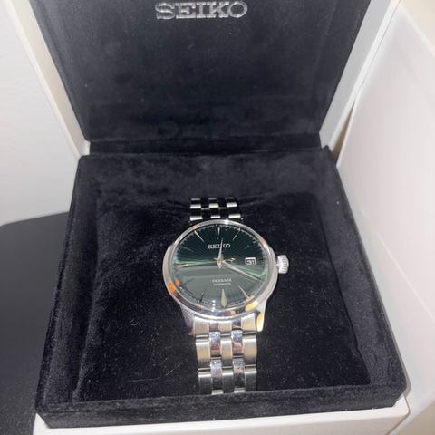 Säljer en mycket fin Seiko Presage automatic med blå urtavla och brunt läderband. Inköpt I juli 2025. Använd endast 2ggr, således fortfarande som ny. Finns inga som helst kosmetiska spår eller defekter.