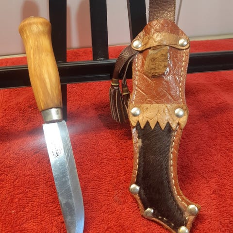 Handgjord jakt kniv som fick namn ”Golden Dragon ”.Laminerat damaskblad av Pinogorov med koppar linje och skaftet är stabiliserad mammutbete, juma, elforyn, tenn och mosaikpins.Slida av shaftläder med drake.