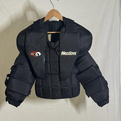 Easton Jr ishockeyskydd i blå färg med detaljer i rött och vitt. Designade för juniorer, lämpliga för ishockeyspel. Tillverkade med material som erbjuder skydd och komfort under spel.