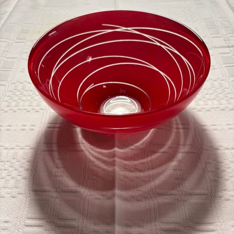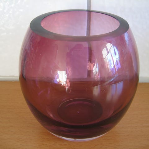 Vackert melerat glas i vitt och grönt på klarglas. Tjockt glas så den är mycket stabil. Den väger hela 0,8 kg.