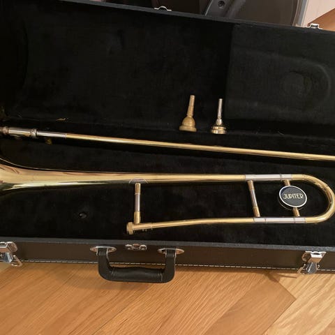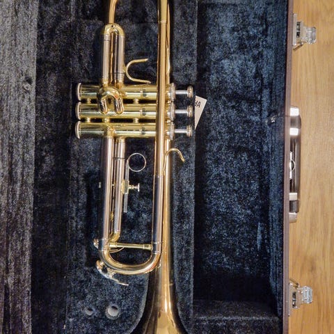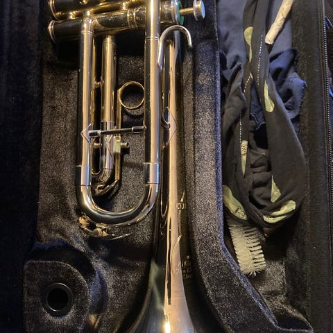 Trumpet, Louis Robert med tillbehör inklusive munstycke, rengöringsborste, ventilolja, och rengöringsduk.